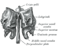 - Den vertikala perpendikulära plattan (lamina perpendicularis), som är en del av nässkiljeväggen.